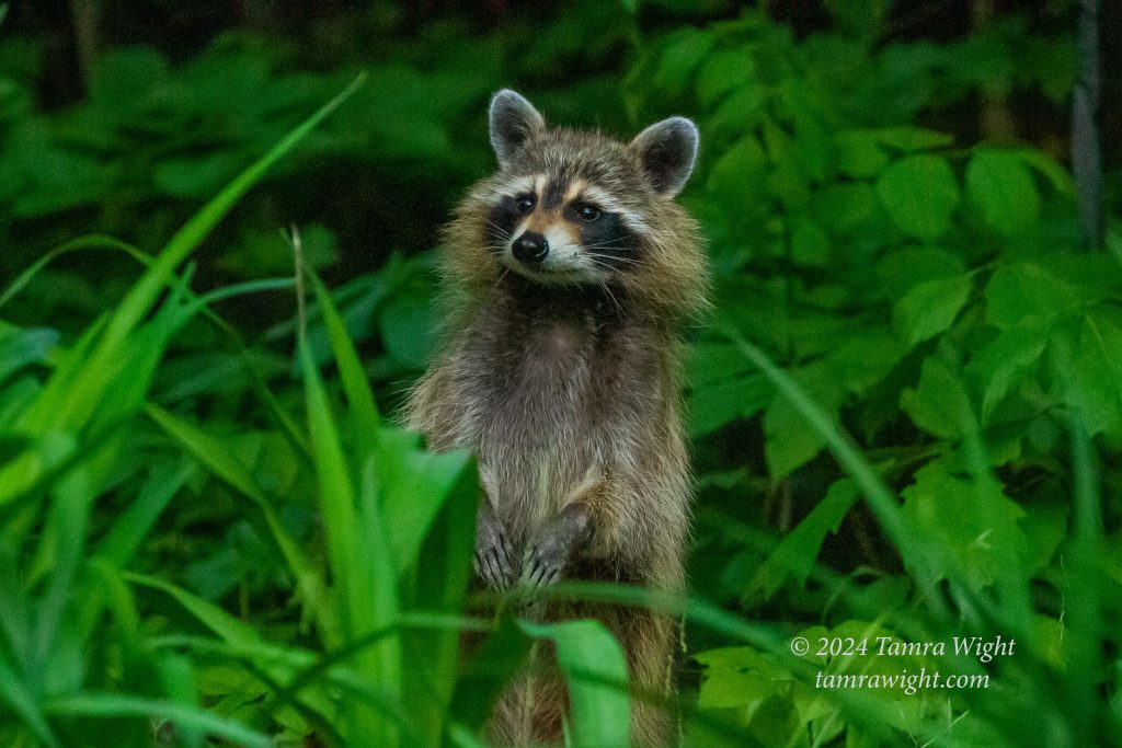 We had a young raccoon pop up in the middle of my lily flower garden one evening at dusk. I'm not sure who was more startled, it or us! I was able to get a couple quick pictures before it ambled off.