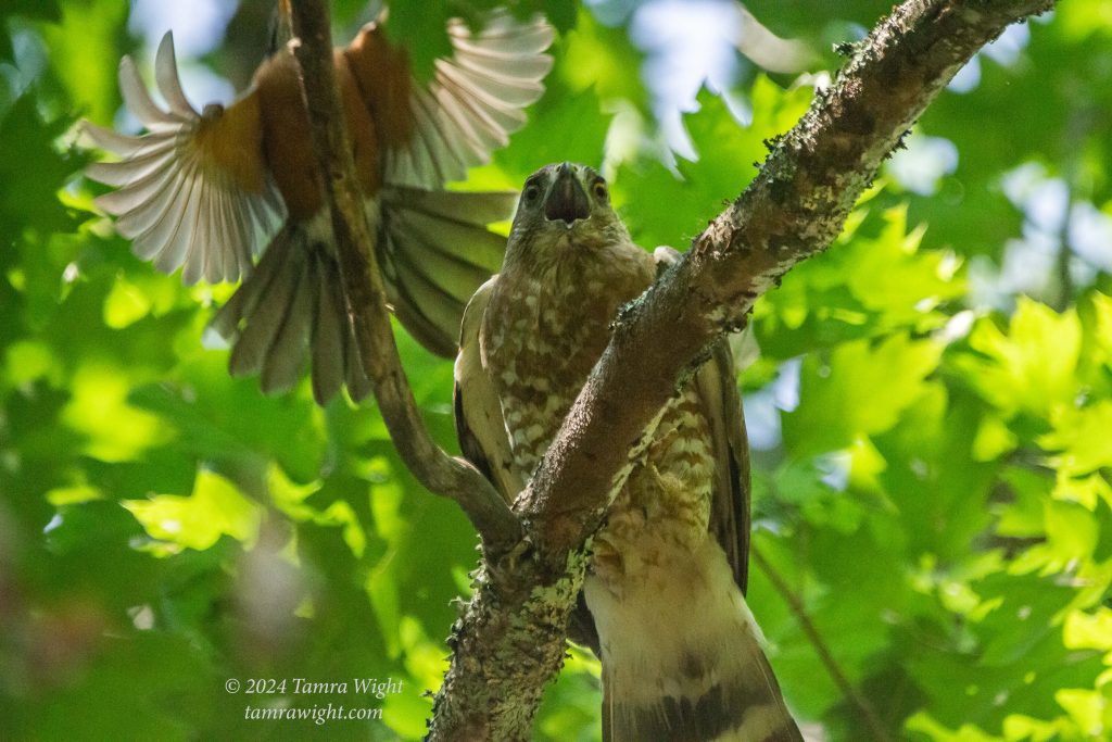 Three times this week while power walking on our lakeside road, a broad-winged hawk flew out of the woods to a branch over my head, and began to call very, very loudly. The third time it happened, I ran home to grab my camera! While taking pictures, I could hear lots and lots of songbirds in the surrounding trees. I also heard a distant answering call to the hawk. Putting it all together, I believe the broad-winged hawk was a young one, perhaps newly off the nest, who was being harassed by the area song birds, including the robin in the photo above.