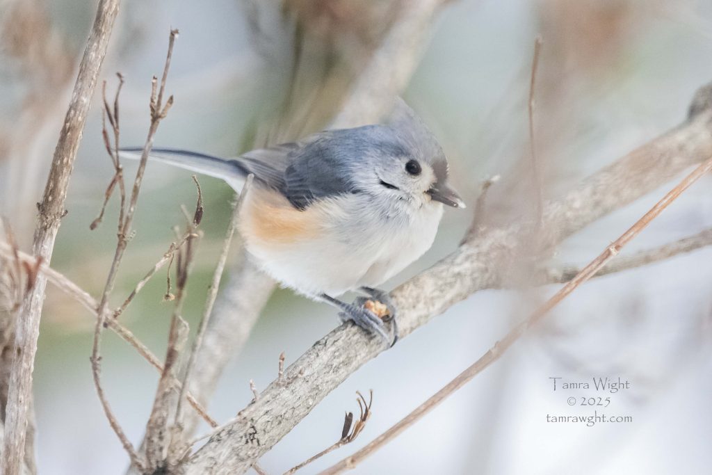 A tufted-titmouse likes sunflower seeds, but eat peanuts too.