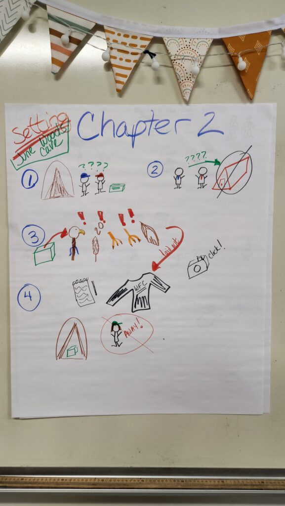 We model how to draw notes based on the text – either on the white board, or large paper to keep it for recaps. We carefully explain that the main rule of sketch notes is to only draw what you hear. So if we’re reading about ice fishing, we need to draw what the characters are seeing or doing if it is important to the story. You’ll notice below, that Shannon and I draw the big events and number them in order. We also use words and colors, and encourage our readers to do so as well. Here are our sample sketch notes from Chapters 1 through 4.